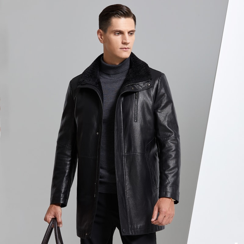 Manteau en cuir mi-long décontracté noir avec fourrure et revers en peau de mouton pour homme