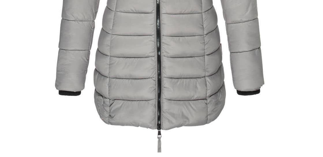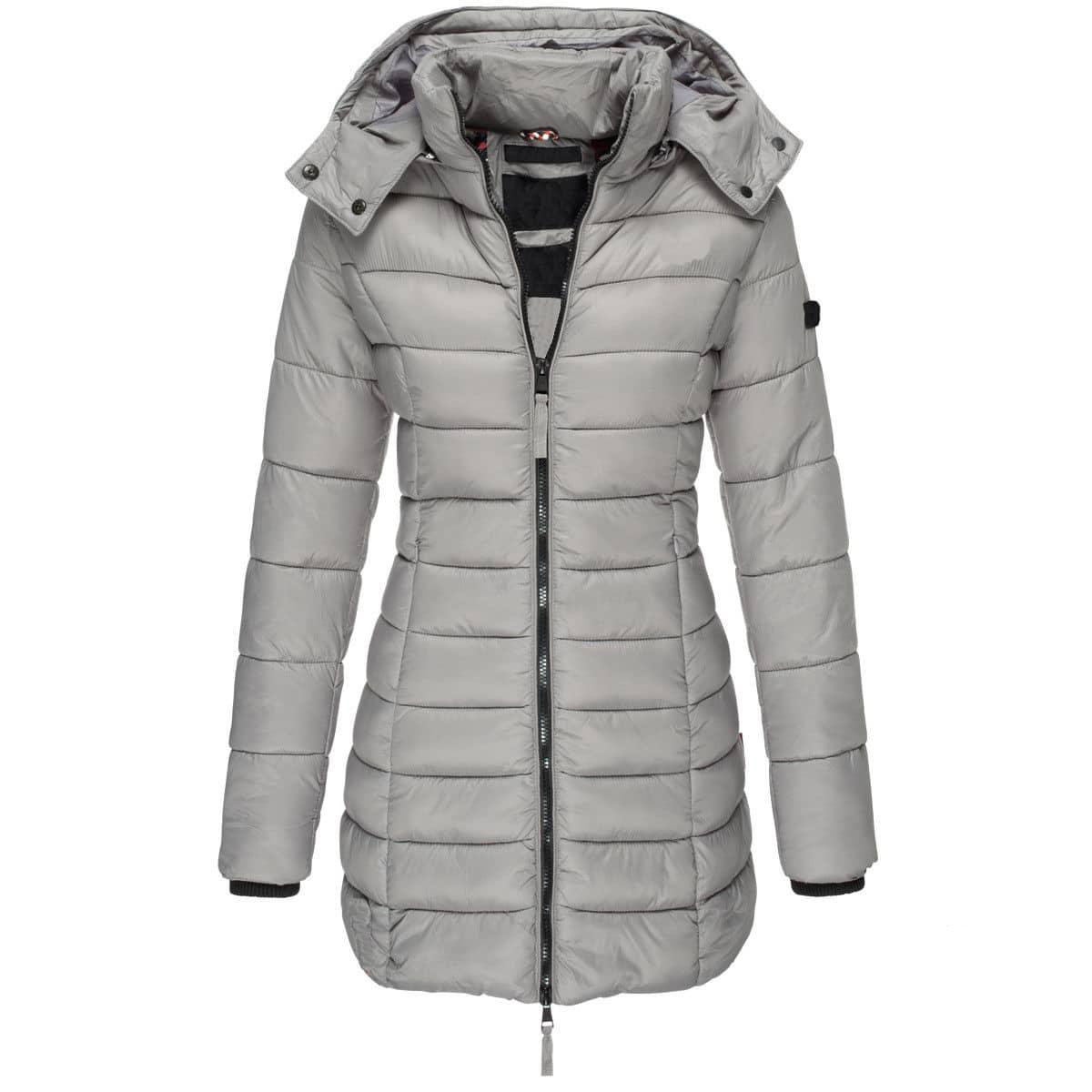 Manteau long d'hiver matelassé gris avec capuche pour femmes avec fermeture centrale
