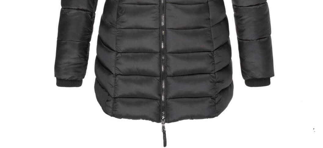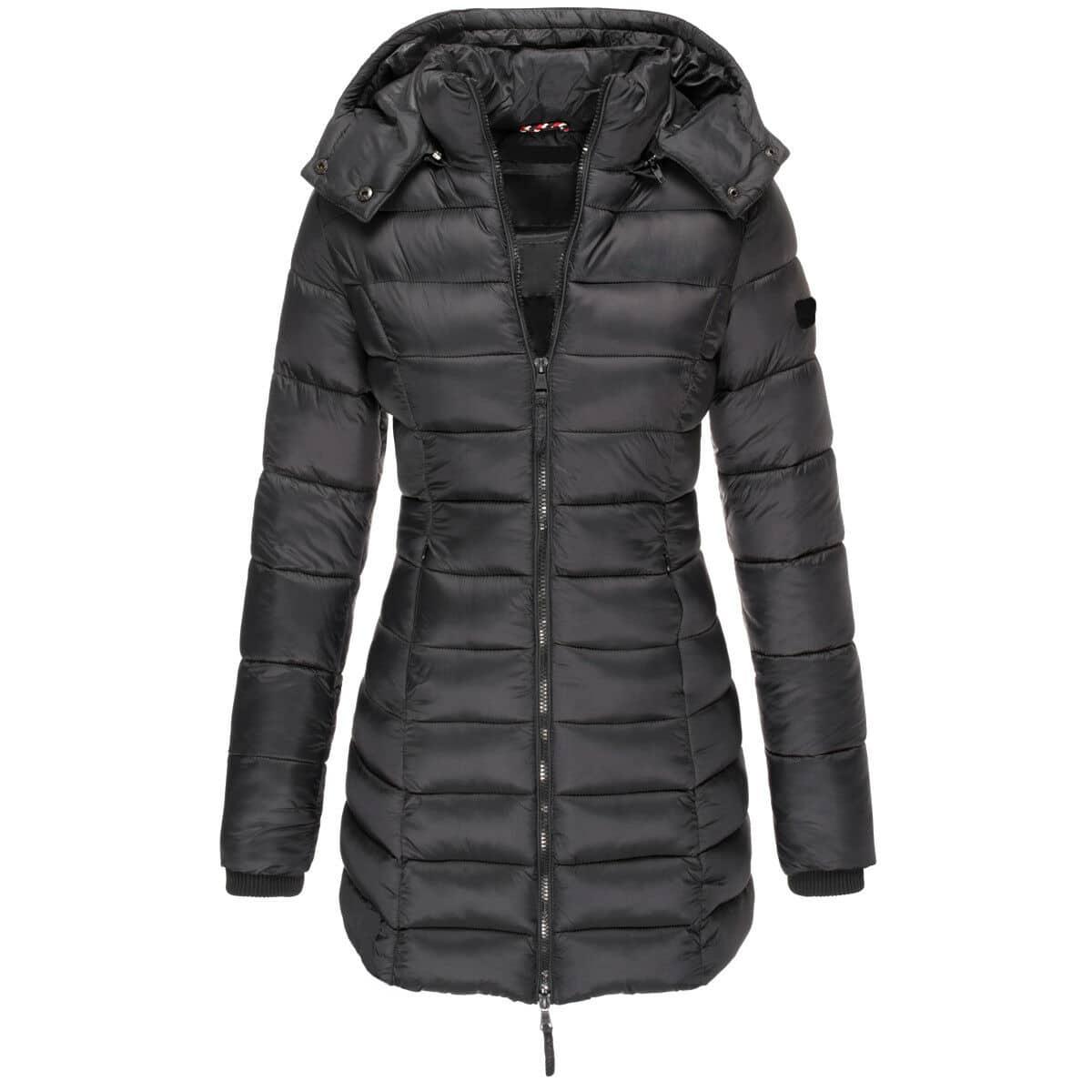 Manteau long d'hiver matelassé noir avec capuche pour femmes avec fermeture centrale