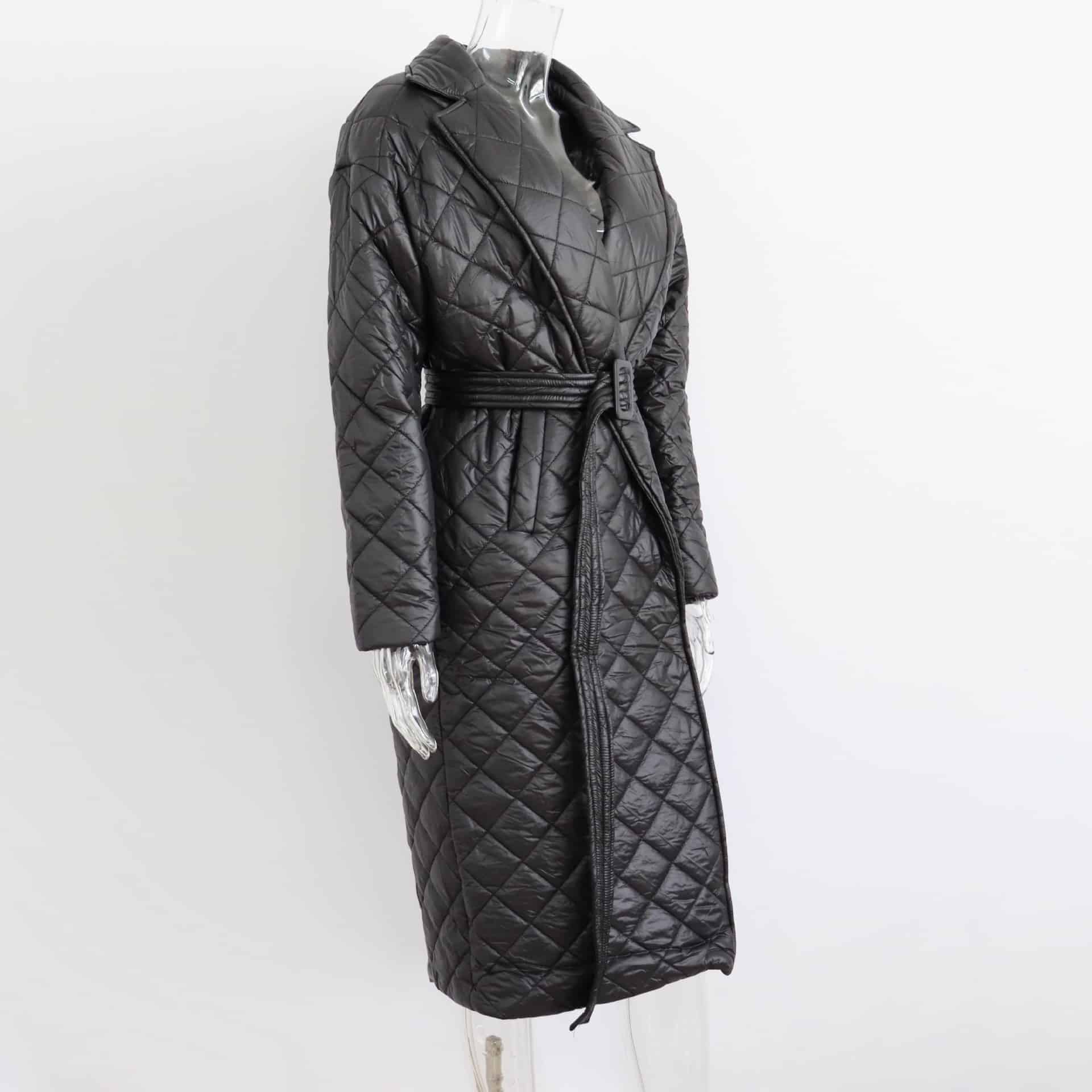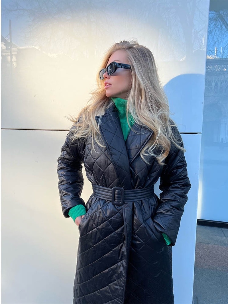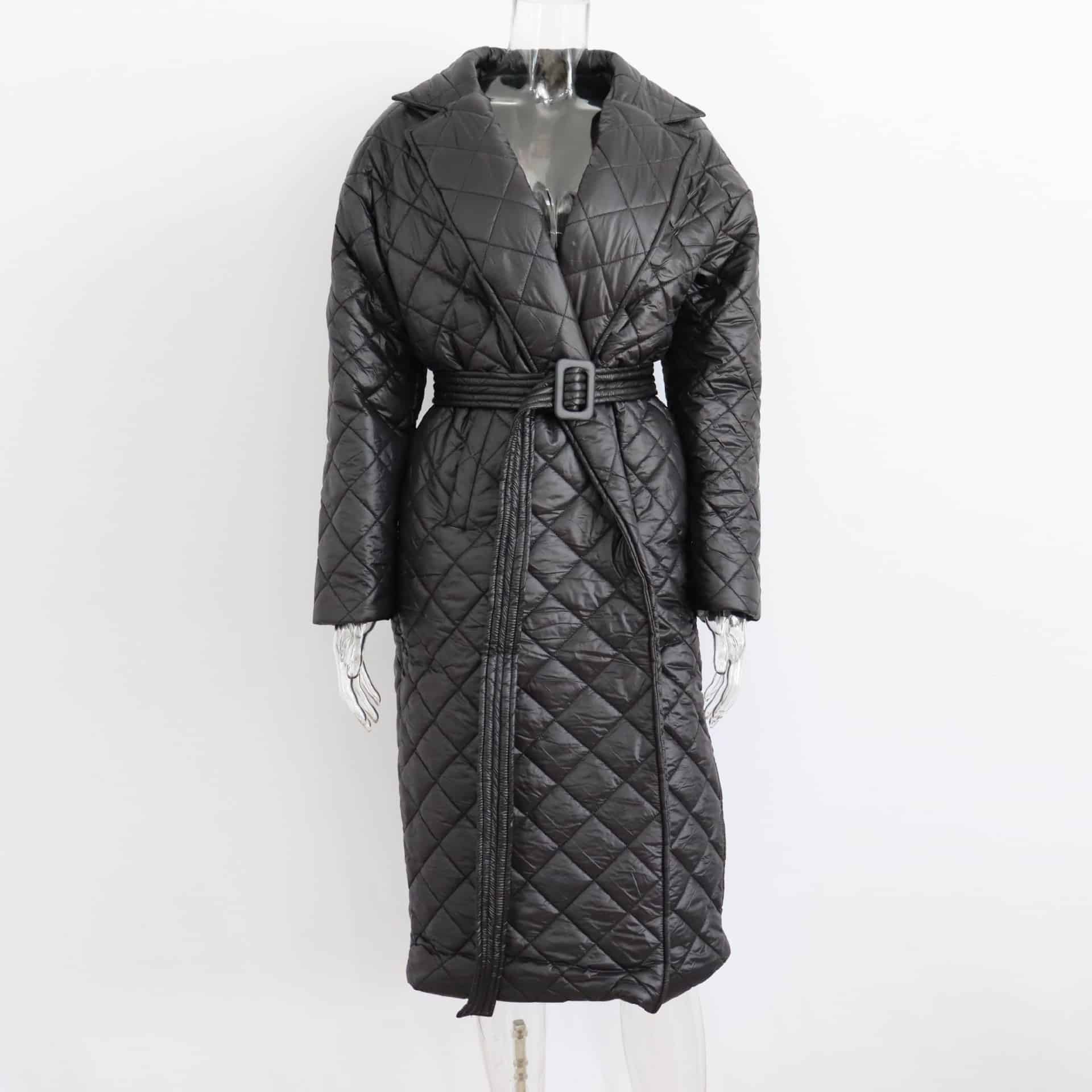 <strong>Mots clés importants:</strong> manteau matelassé, noir, coton, élégant, confortable, durabilité, design matelassé, ceinture, col rabattu, doublure chaude.
